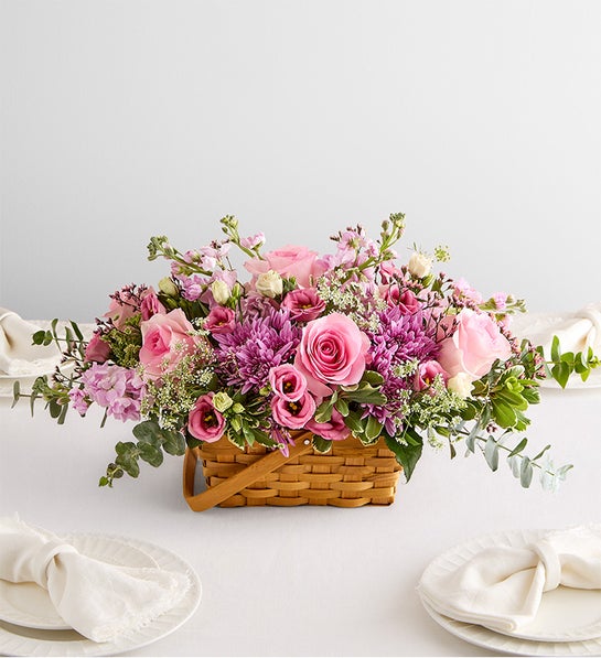NEW Both bountiful and beautiful, this centerpiece arrangement will brighten the table at any gathering. Pink roses, lisianthuses, and other welcoming blooms are gracefully designed in a woven basket for fresh-from-the-garden charm.