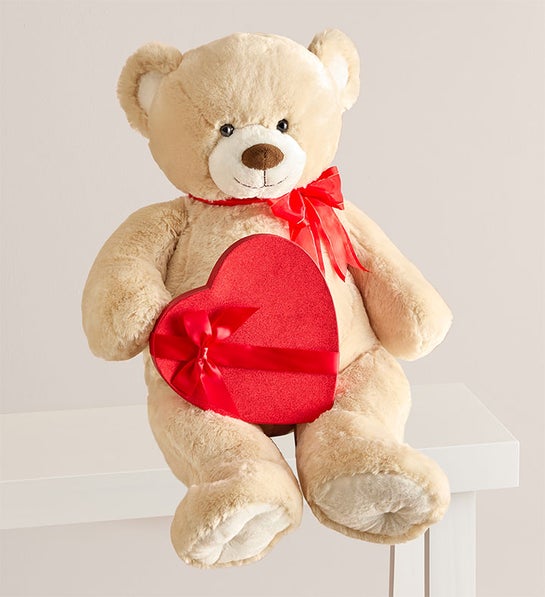 EXCLUSIVE Big on hugs, big on romance. From our Lotsa Love collection, this super-soft teddy measures nearly three feet from head to paw and wears a gold-trimmed red ribbon for extra adorableness. Make your warm and fuzzy surprise even sweeter by adding on a heart-shape box of 28 chocolates.