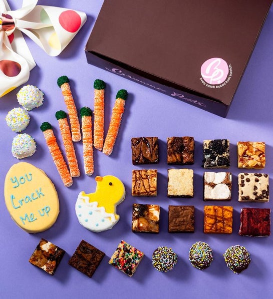 You Crack Me Up Includes The Following Individually Wrapped Items: 15 Baby Brownies 1 BrowniEmoji Egg (You Crack Me Up) 1 BrowniEmoji Chick in Egg 6 Brownie Bruffles (Spring) 3 2pk Hand Dipped Pretzels (Carrots)